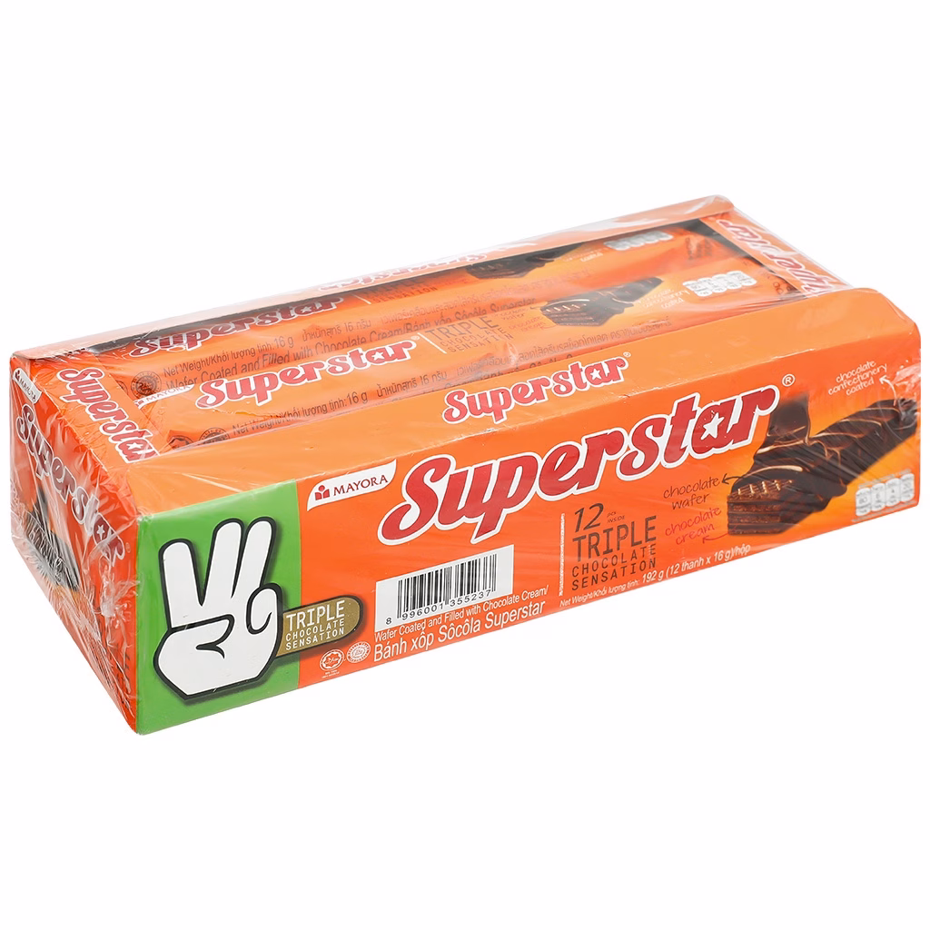 Một trong những nhãn hiệu bánh xốp phủ kem socola uy tín và có tiếng tại Việt Nam là Superstar. Bánh xốp phủ kem socola Superstar hộp 250g (20 gói x 12,5g) là một sản phẩm được nhiều người yêu thích.