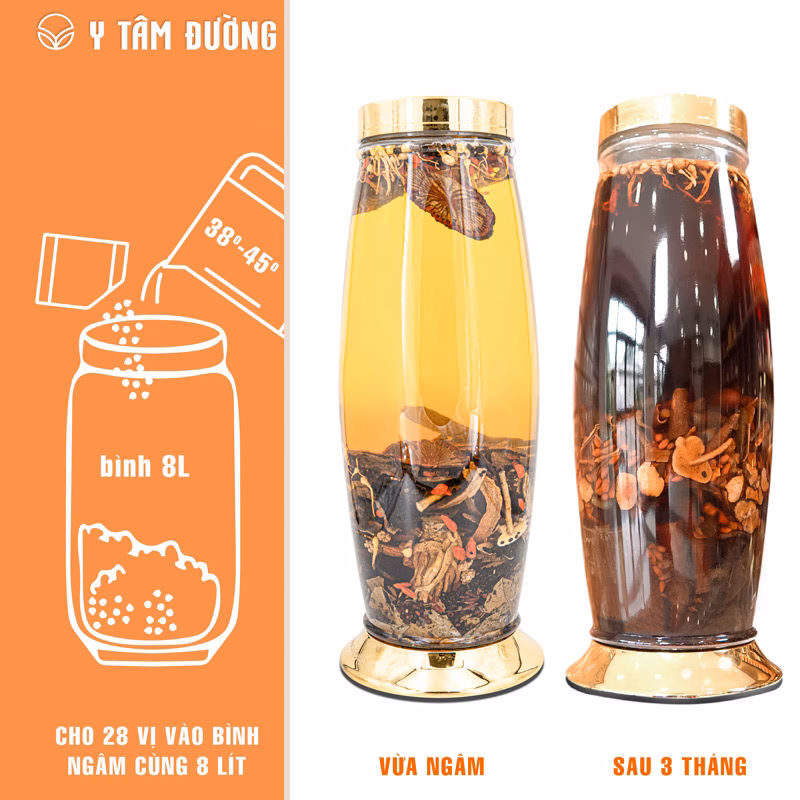 - Ngâm sản phẩm vào rượu đúng cách: Bạn cần ngâm sản phẩm vào rượu với tỷ lệ phù hợp, thường là 1 thang thảo mộc với 8 lít rượu.
