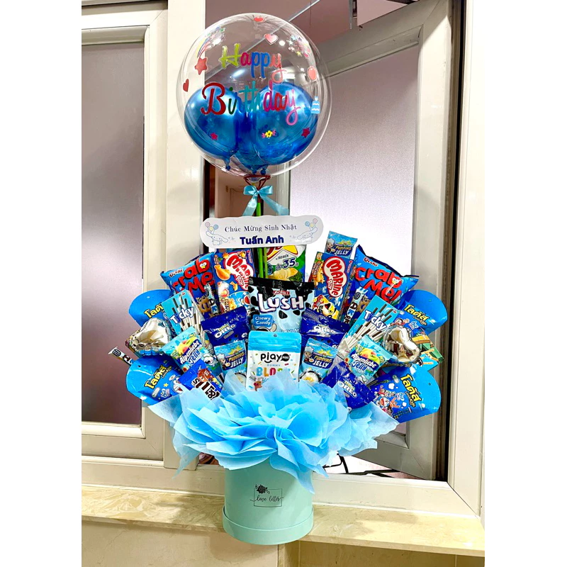 Nếu bạn đang tìm kiếm một món quà đặc biệt cho bé trai của mình, hãy tham khảo giỏ quà bánh kẹo màu xanh dương siêu đẹp. Giỏ quà này được thiết kế với màu sắc tươi sáng, phù hợp với các bé trai năng động và hoạt bát. Sản phẩm có chứa nhiều loại bánh kẹo ngon và đảm bảo chất lượng, là lựa chọn tuyệt vời cho ngày sinh nhật của bé.